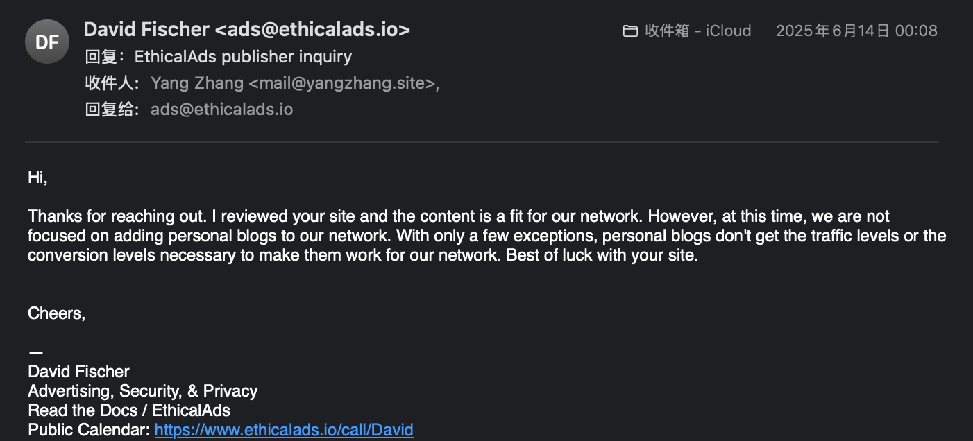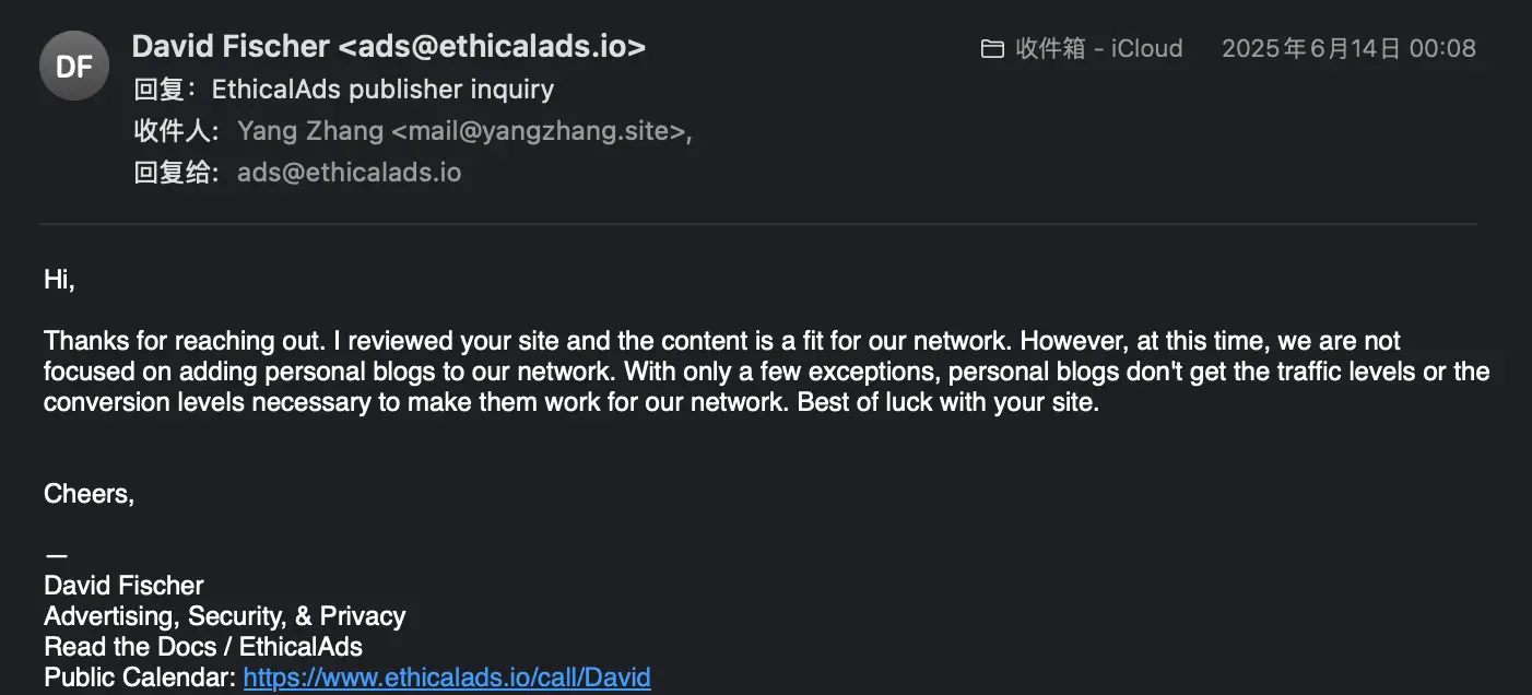 我也一直在找质量高一些的广告平台,之前看到了针对开发者的EthicalAds感觉不错,但是他们不接受个人网站: