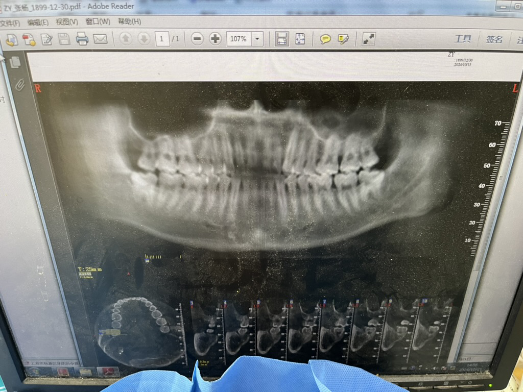牙疼,具体来说是牙龈疼。疼得我吃嘛嘛不香、非常心烦,于是在一个平平无奇的周三,我去了一趟牙诊所。买了一个99¥的洗牙套餐,拍了一张牙片: