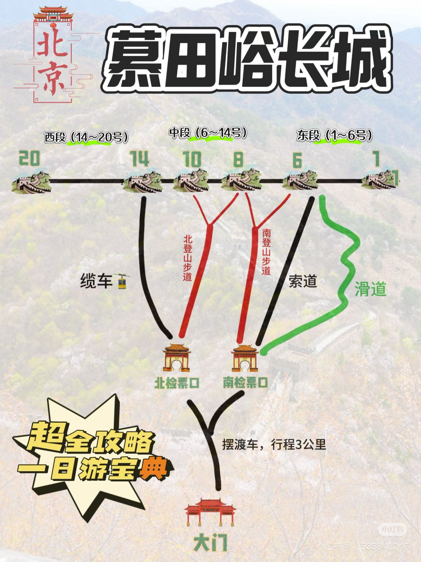 去的时候没堵车,一个半小时准时到达。慕田峪长城还是得做一下攻略的,如果随机游走的话脚怕是要断掉: