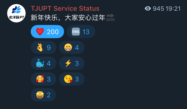blog 北洋园¶ 北洋园是我最早接触的PT站点,也是我最常逛、最喜欢的PT站,我日夜做种终于刷到了CrazyUser。然而最近它挂了😭 如今又是新的一年,少了每日必看的趣味盒、少了吹水的评论区、少了紧跟时事热点的置顶种子、少了滚动的影视Banner,总感觉不对味。 但愿早日再次相见! 新年快乐! 最后更新: 2025-01-01 18:25:07 创建日期: 2025-01-01 18:25:07 Was this page helpful? Thanks for your feedback! Thanks for your feedback! Help me improve this page by using the feedback form. 广告 人要恰饭的嘛🤑🤑 评论