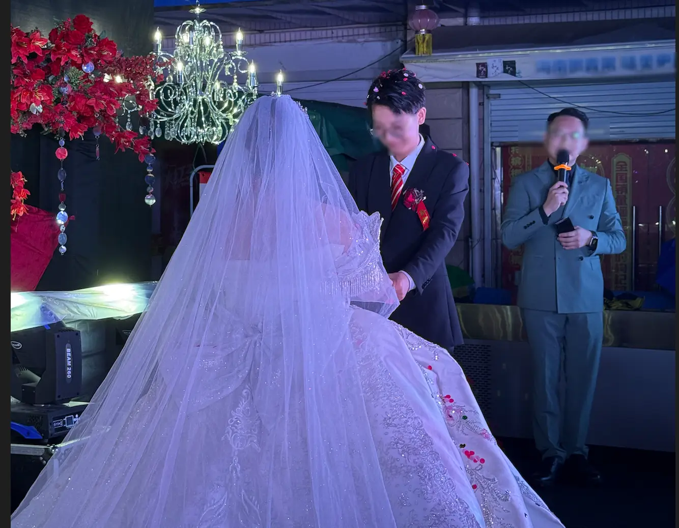 到这里我已经很累了,新郎也累趴了。不过中式婚礼仍在继续,我们直接快进到捅窗户纸。喊一句吉祥话戳一根筷子,最后一把梭。随着红色筷子落在新娘的裙摆上,中式婚礼也就此暂告一段落。
