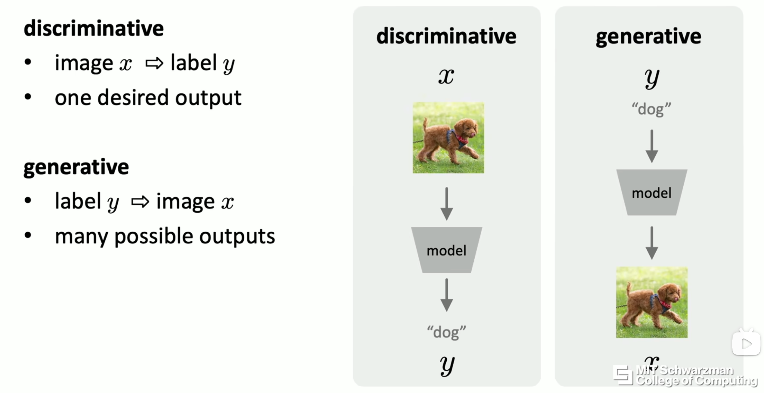 kaiming的这张图用图像分类和图像生成这个例子展示了他们最大的区别:判别式模型往往有固定的预期输出,而生成式模型的输出并不固定。