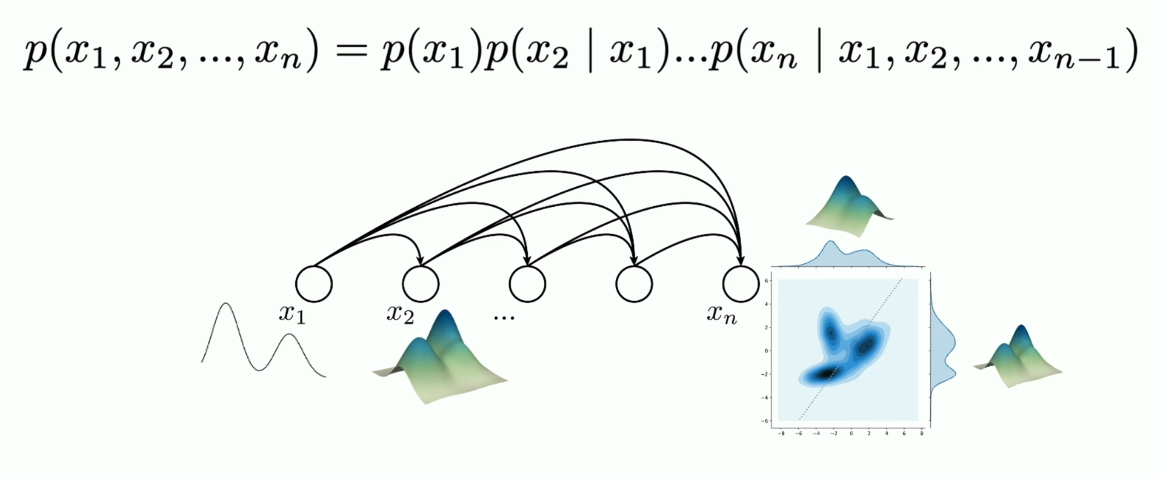 而真正的生成式模型往往需要面对复杂得多的分布,例如图片(可以建模为$m*n$个随机变量的分布)、文本、视频等等。