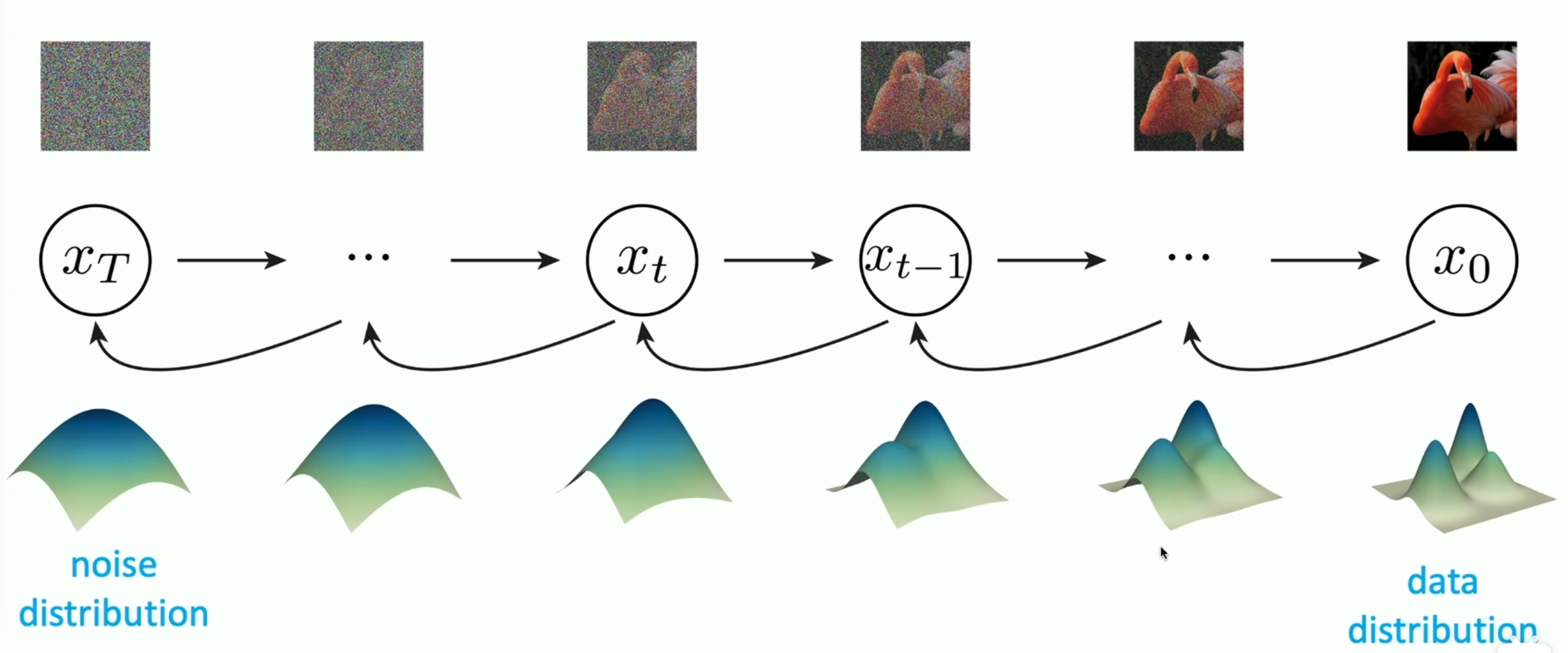 - Diffusion:基于热力学,模拟逐步加噪、逐步去噪的过程