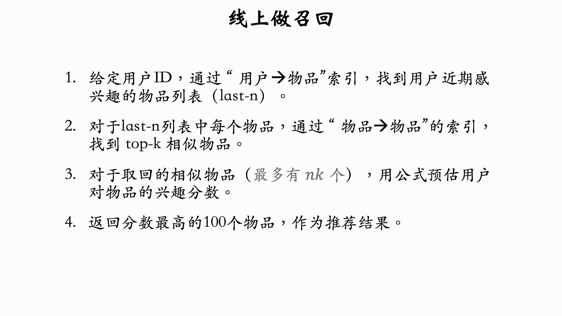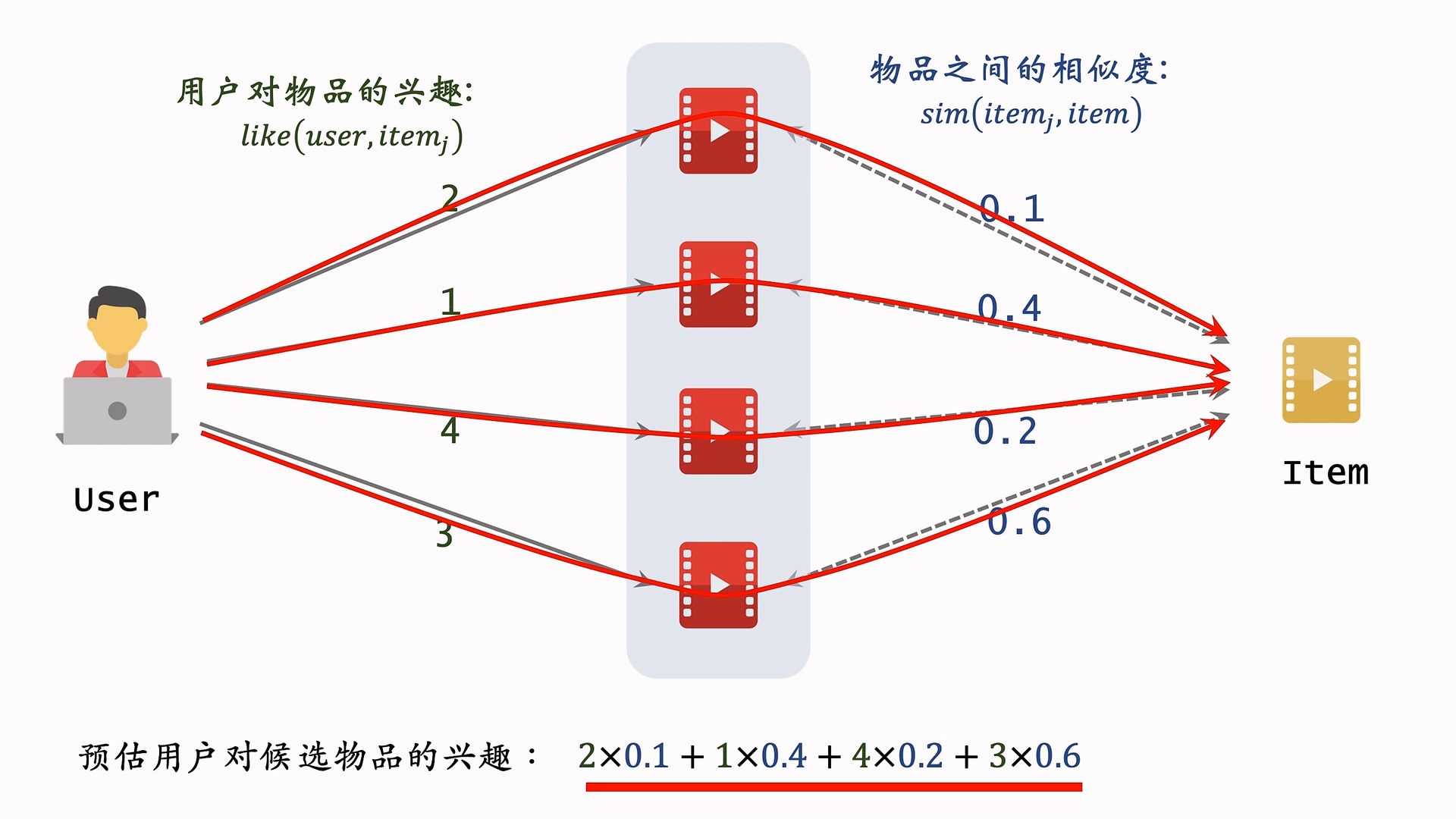 Alg Papers 推荐 召回 召回1:ItemCF¶ 核心问题:如何判断Item之间的相似性? 基于知识图谱:例如两本书同作者 基于用户行为 加入喜爱程度的度量(cosine distance): ItemCF算法流程: 基于用户交互过的物品进行兴趣打分 对于候选物品,计算相似性 计算兴趣的相似度加权和,作为用户对候选物品的兴趣估计 算法部署流程: 最后更新: 2025-07-13 21:45:06 创建日期: 2025-03-19 17:57:13 Was this page helpful? Thanks for your feedback! Thanks for your feedback! Help me improve this page by using the feedback form. 广告 人要恰饭的嘛🤑🤑 评论