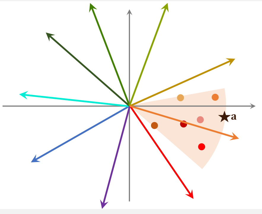 我们提前把数据库中的物品进行聚类,给每个分区一个索引(对于余弦相似度,分区就是扇形的;对于L2距离,分区就是正方形的?)。