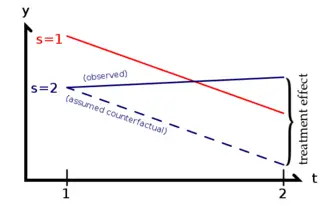Idea: 如果我们在干预前后都有观测就可以考虑 DID 方法。DID 假设实验组和对照组发展趋势相同(平行时空!)。在 t=1 时刻,实验组实施干预。到了 t=2 时刻,计算实验组指标变化量和对照组指标变化量之间的差值(双重差分,也就是 DID)。按照假设,这个值应该和 0 接近。收集样本之后做假设检验即可,如果 DID 显著大于零,就说明干预对指标有正向的作用。