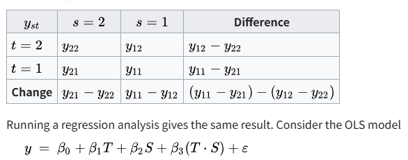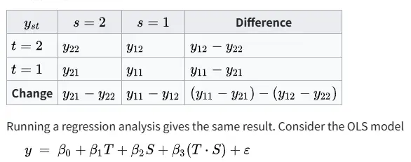 DID 可以用回归来计算,下面的回归系数中 beta_3 就是 DID 的估计值。