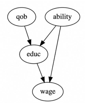 我们就考虑图里受教育程度和工资之间的关系。由于缺少个人能力这个变量,如果我们直接做回归可能存在内生性的问题。所以我们可以使用 IV 方法: