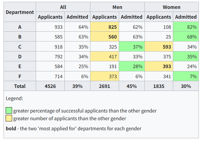 然而当我们把视角转换到院系(上图展示了六个人数最多的院系),就可以发现在大多数的院系(A、B、D、F),女生的录取率都更高。在整个UC Berkeley的85和院系中,有4个院系女性的录取率显著地低于男性,有6个院系男性的录取率显著地低于女性。