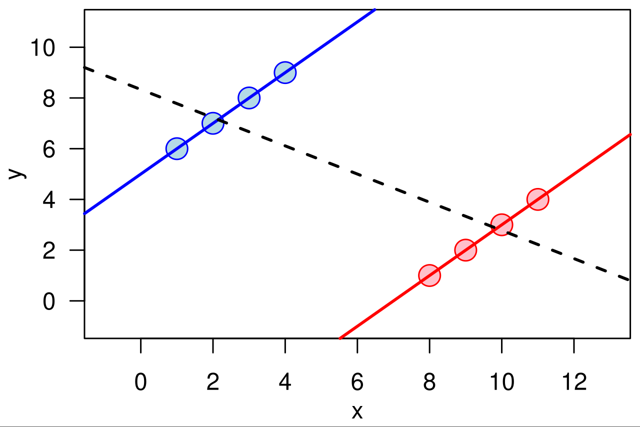 可以看到,xy在红色数据集和蓝色数据集中都各自呈现正相关,然而总体上却呈现负相关。背后就是“红蓝分组”这个变量在作祟。