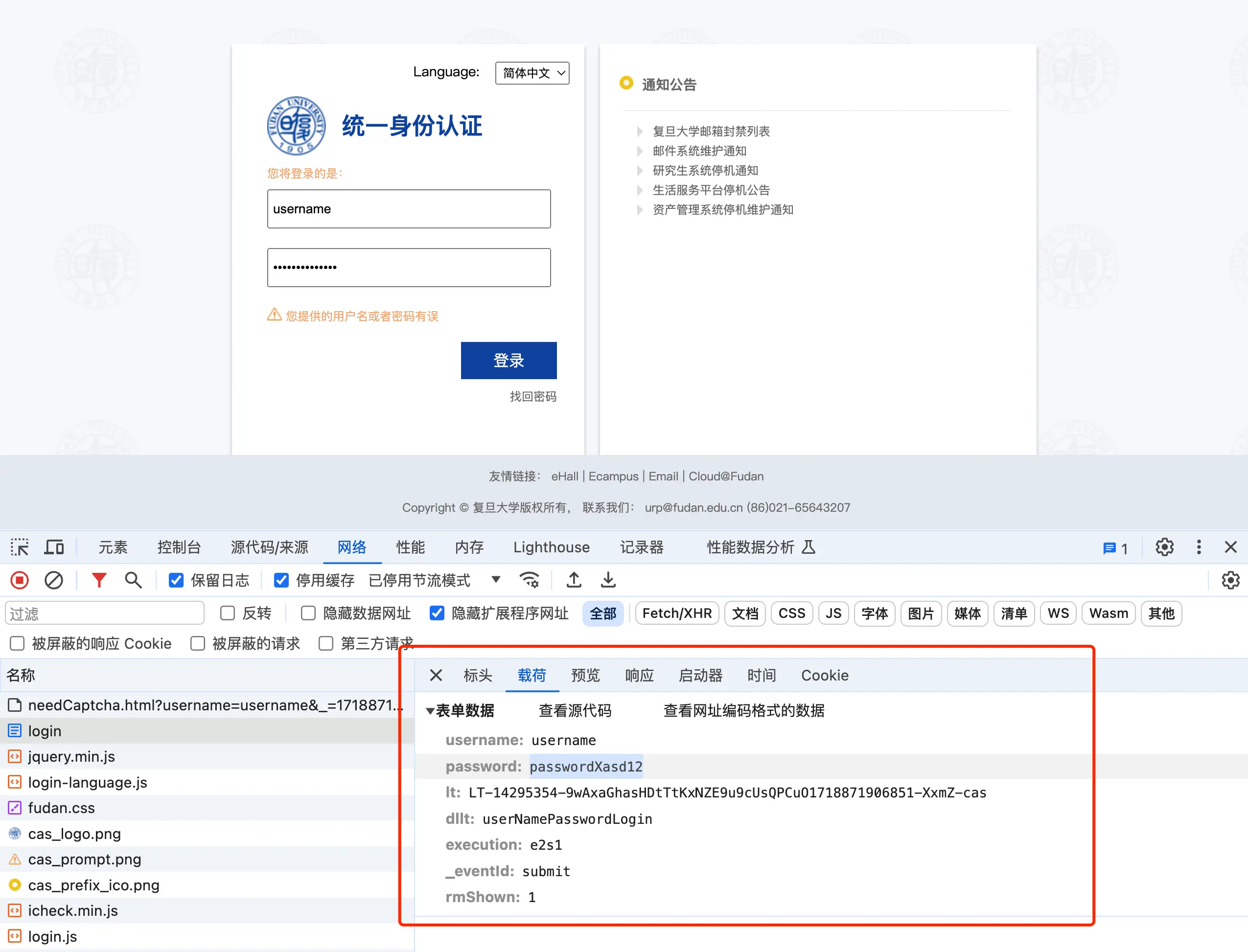 打开https://uis.fudan.edu.cn/authserver/login网页,输入账号密码,简单一看。发现登陆就是一个POST请求。向服务器了下面的内容:
