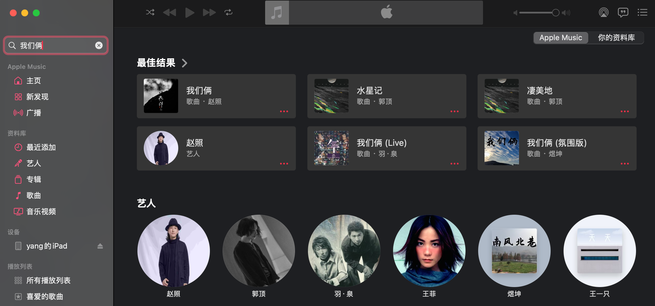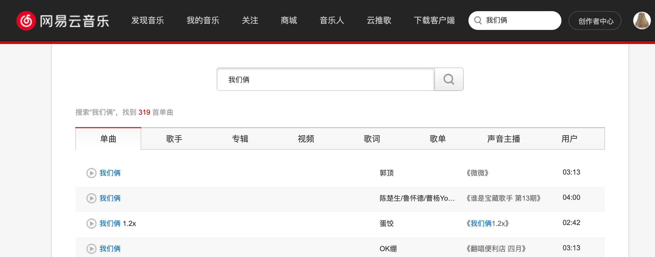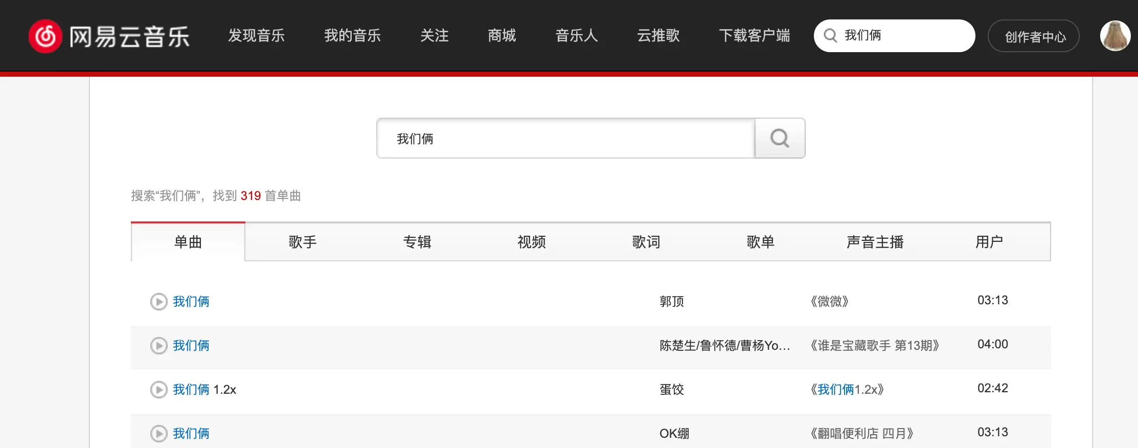 但它有一个致命的缺点:曲库不全。比如你去搜《我们俩》,根本搜不到: