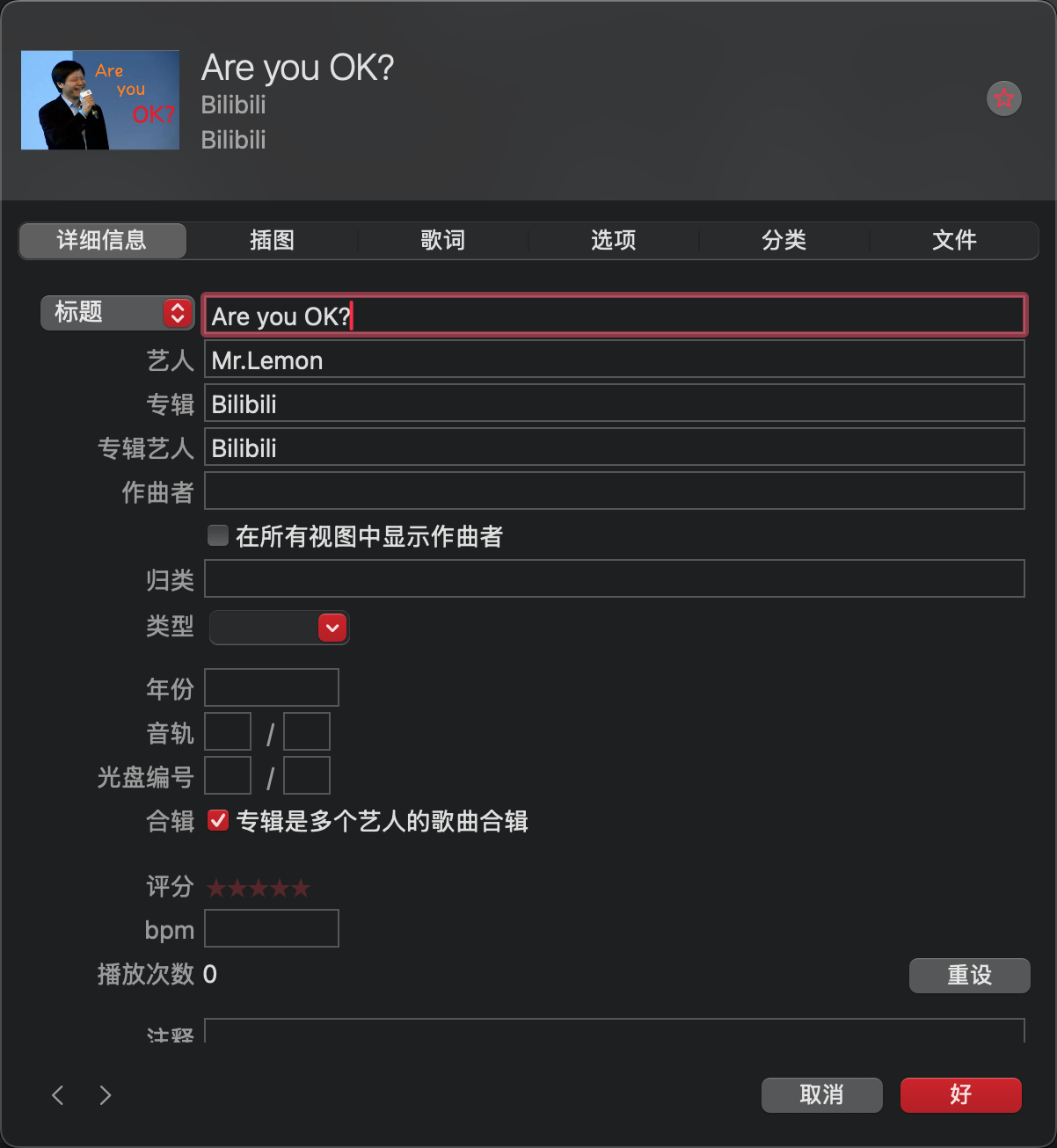 上传的方法也很简单,直接把音乐文件拖拽到歌曲列表就行了。上传完之后,可以手动编辑各种元信息(封面、歌词、歌手、专辑、分类等等):