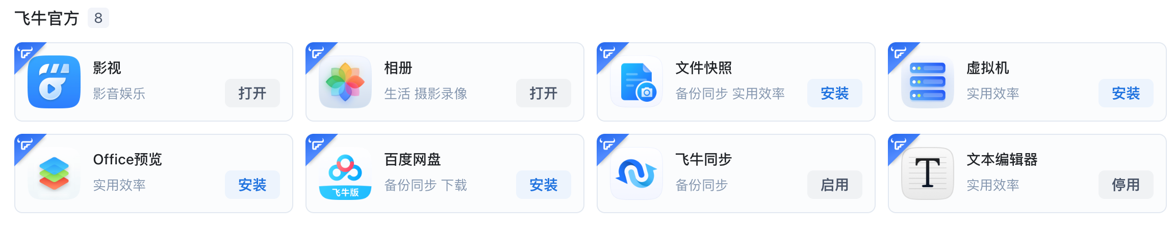 除了上述预装软件,飞牛还有一个应用商店。0.9.29版本,飞牛官方出品的应用如下: