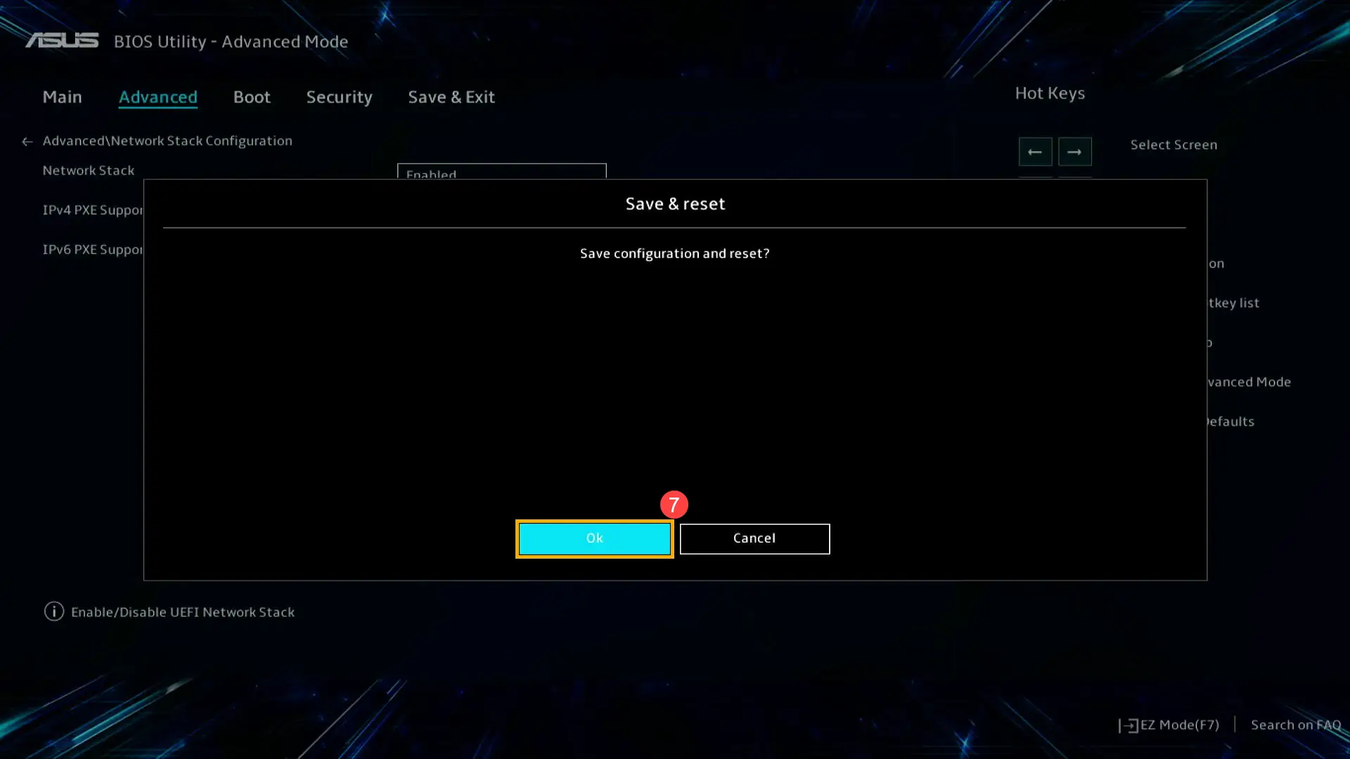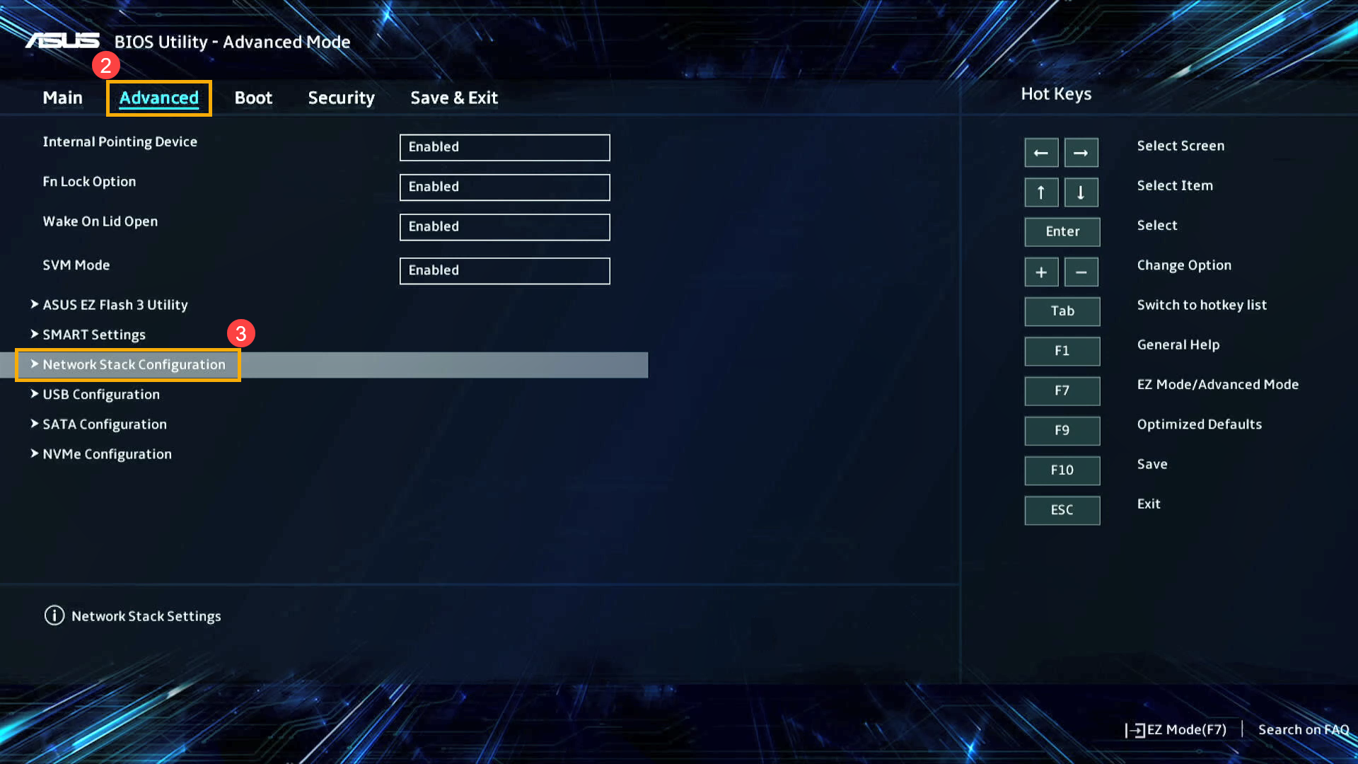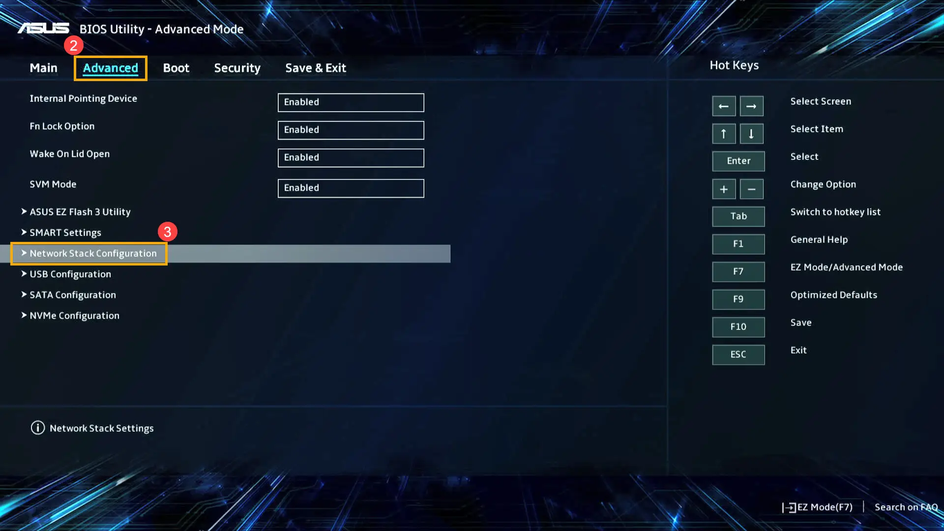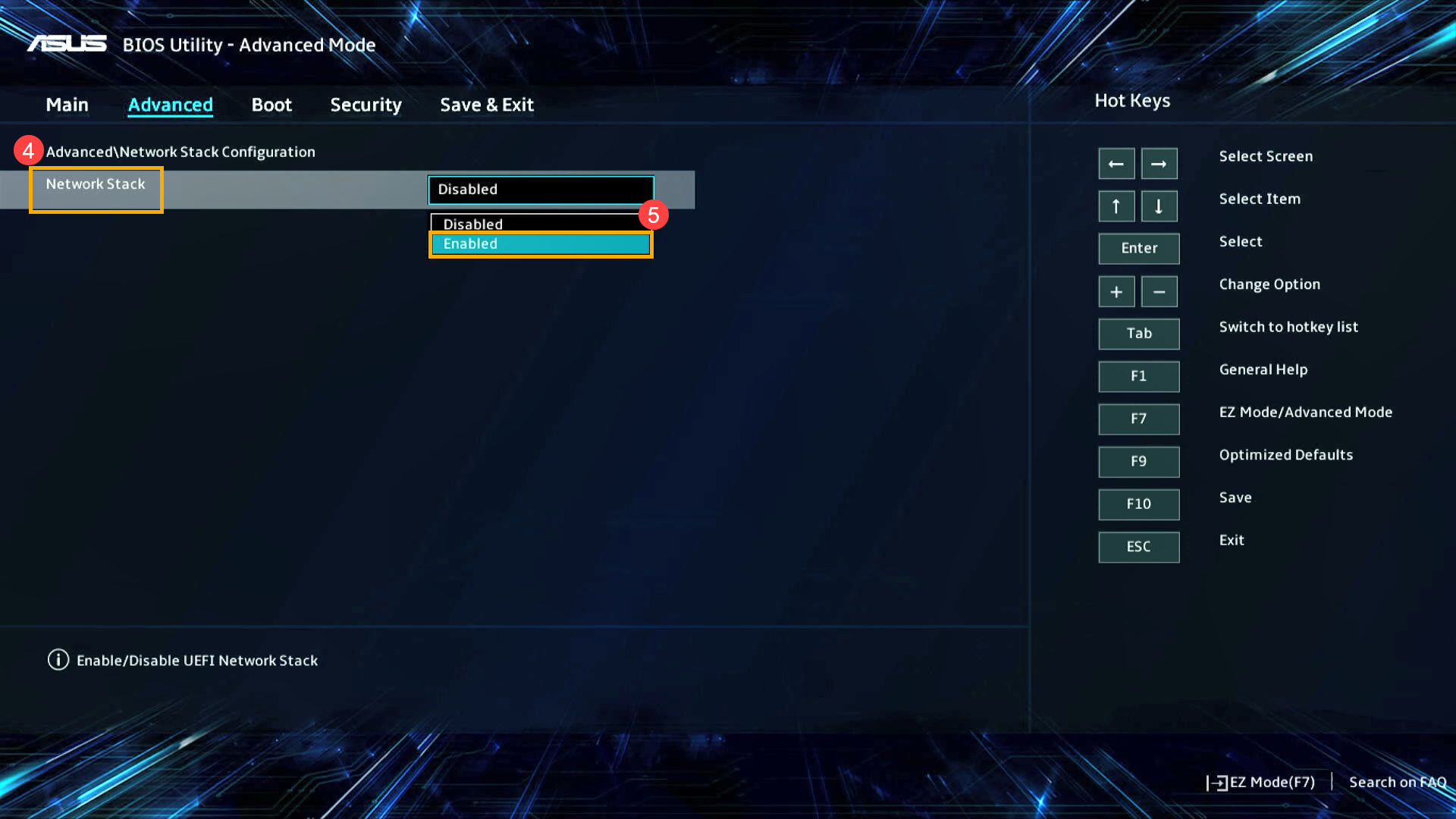 - After entering the Network Stack Configuration, select [Network Stack]④ and set [Enabled]⑤.