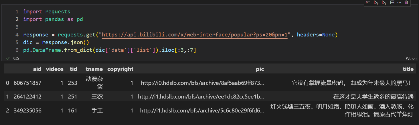 从结果来看,我们只需要简单的几行就可以获取到全套的信息。但是这是建立在我们找到了哔哩哔哩的api:https://api.bilibili.com/x/web-interface/popular?ps=20&pn=1 的基础之上,它直接返回了json数据文件。如果我们找不到api就可能需要写一些正则表达式来提取页面信息了。