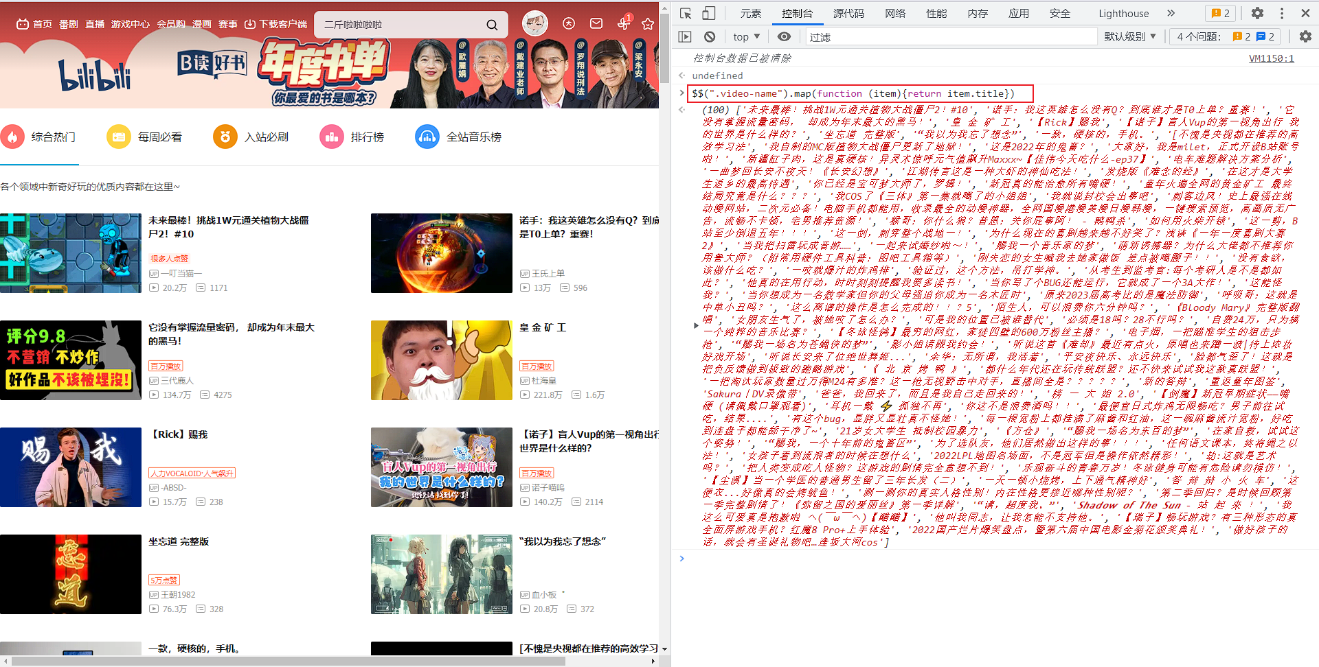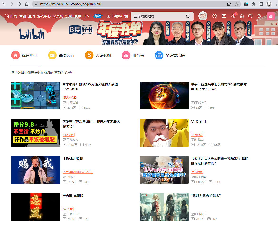 例如,我想获取哔哩哔哩热门页面所有视频的播放量和弹幕数量: