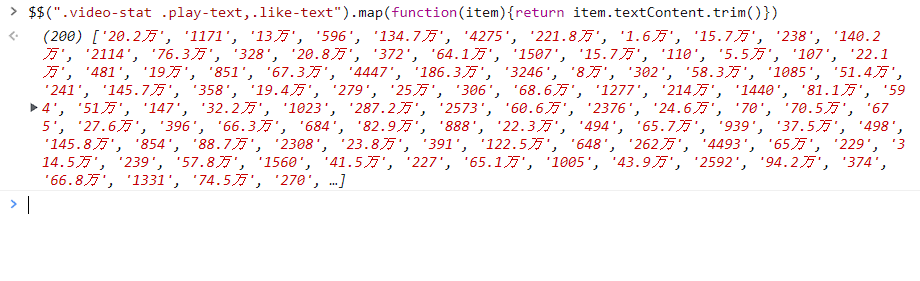$$(".video-stat .play-text,.like-text").map(function(item){return item.textContent.trim()})