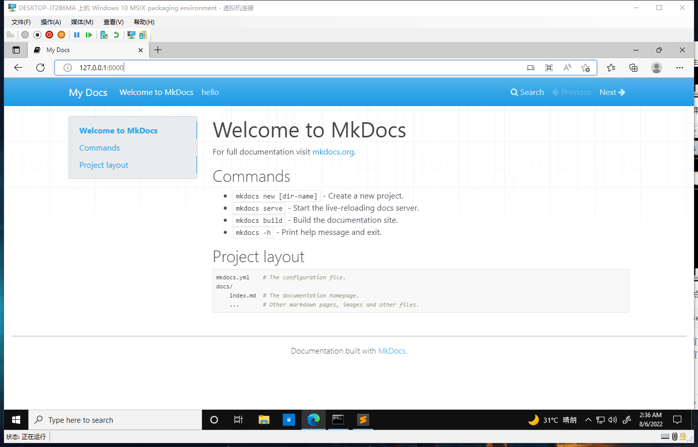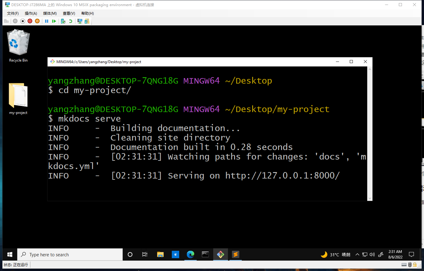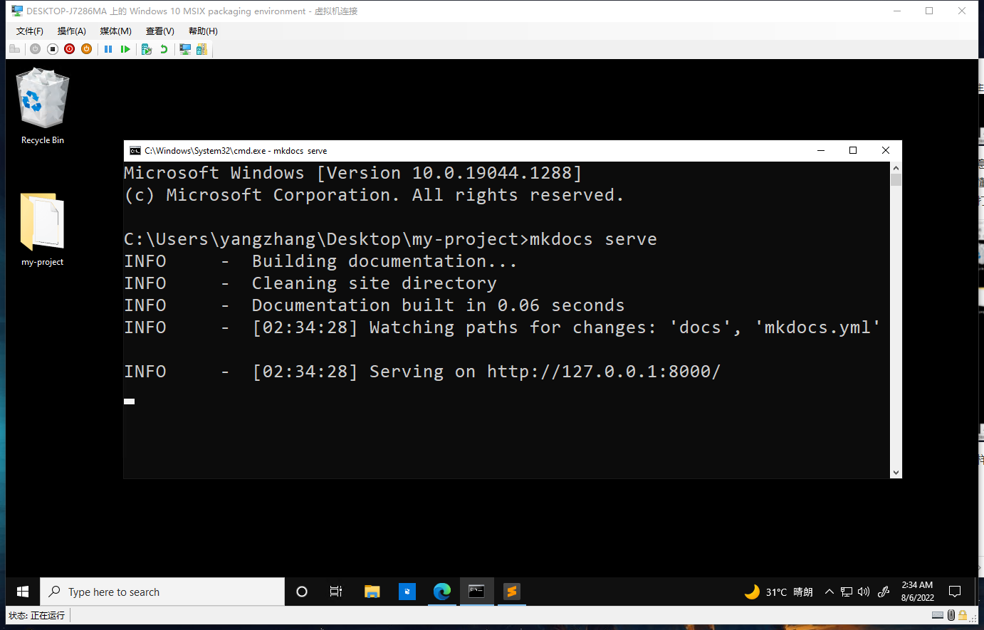 第一条命令是切换到my-project文件夹下面,第二条则是开始mkdocs的服务。