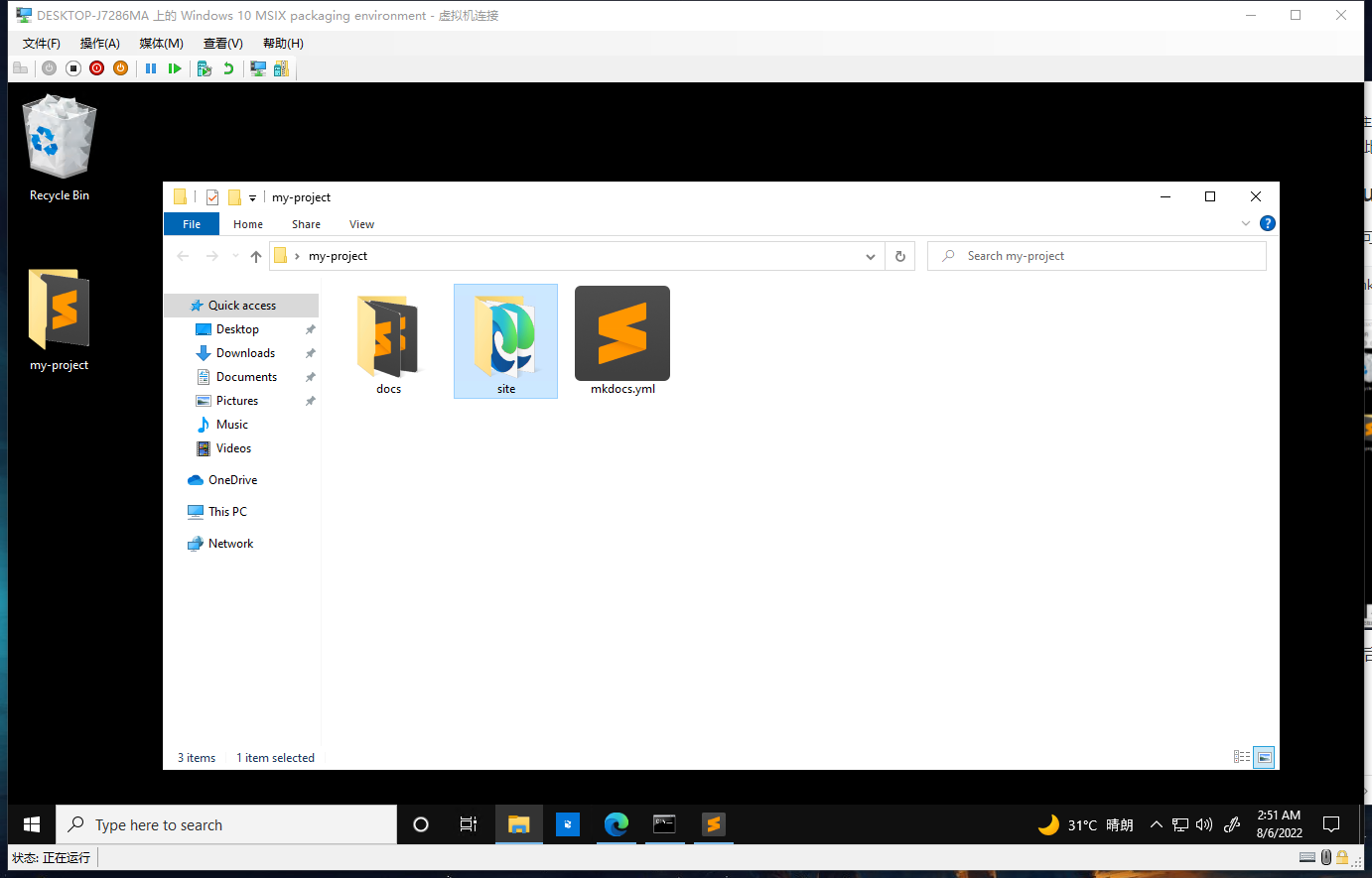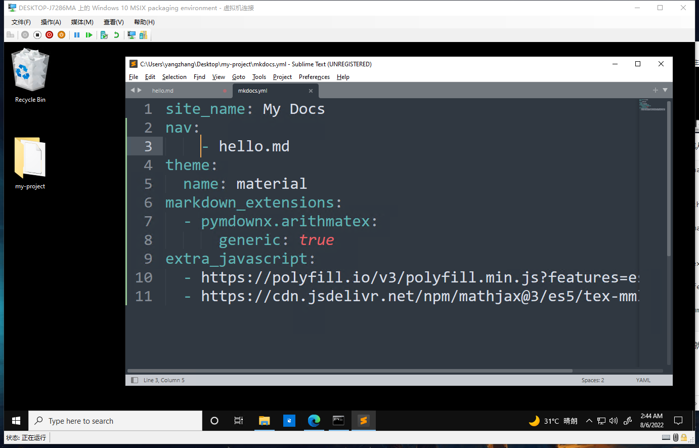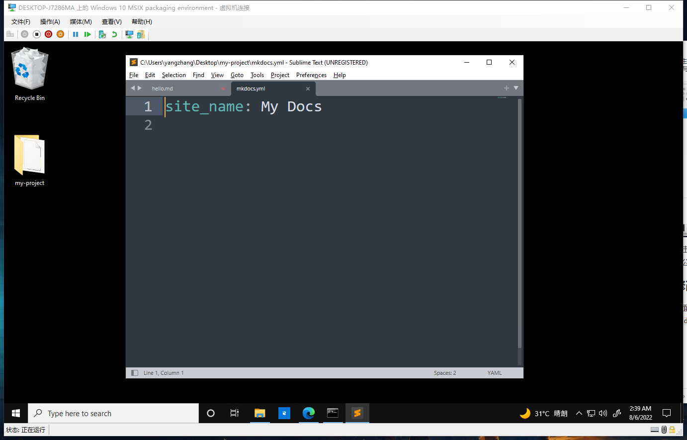 其中mkdocs.yml是项目的配置文件,后续我们要在里面写网站的各类配置。docs/则是存放文章的目录,我们把刚才写好的hello.md移动到这个文件夹下面: