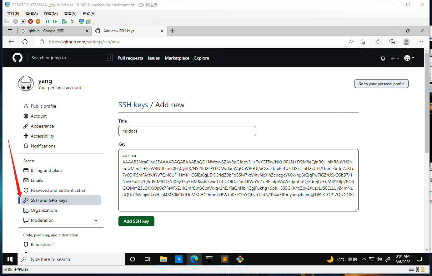 用Sublime Text打开上面的id_rsa.pub公钥文件,复制全部内容,然后到Github上打开自己的ssh配置,添加一个新的ssh key: