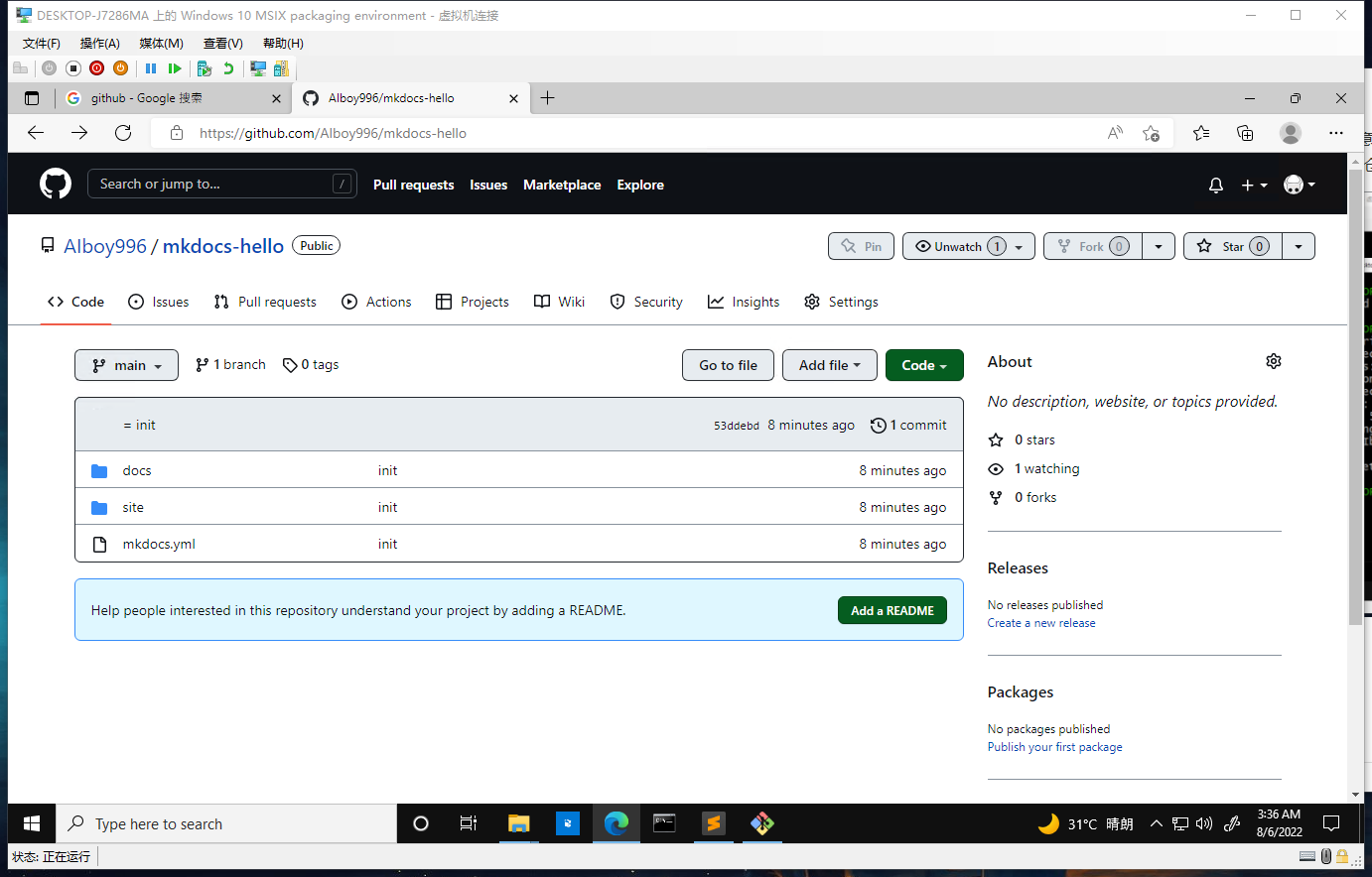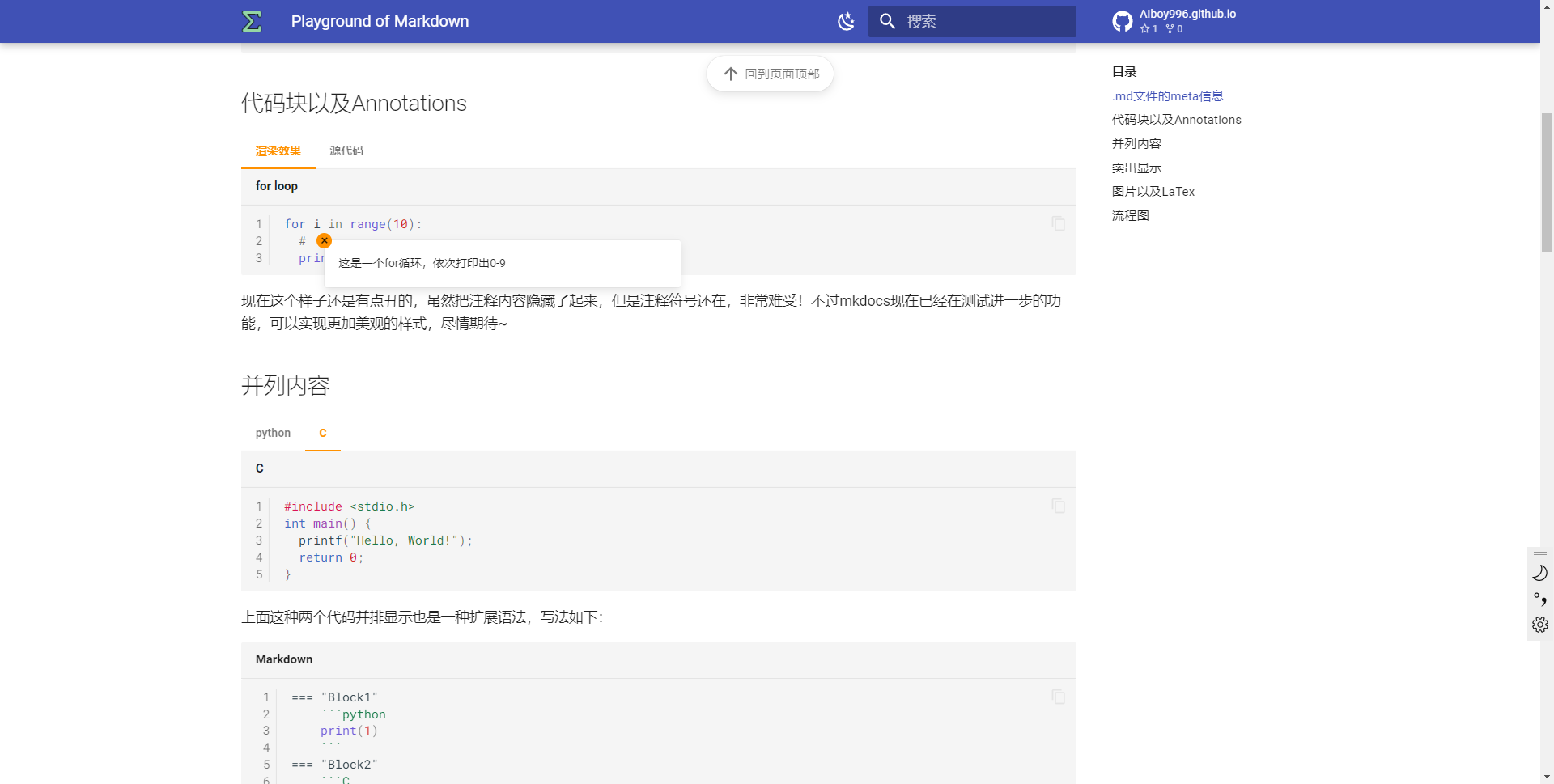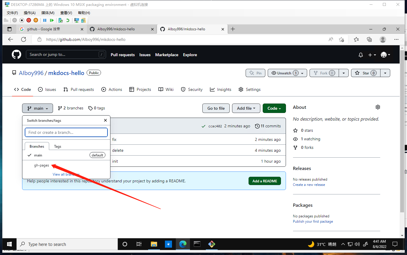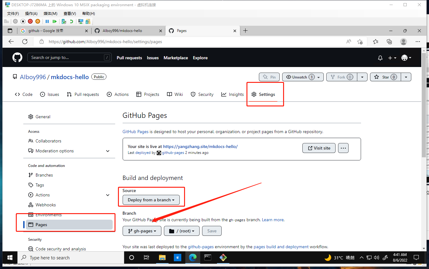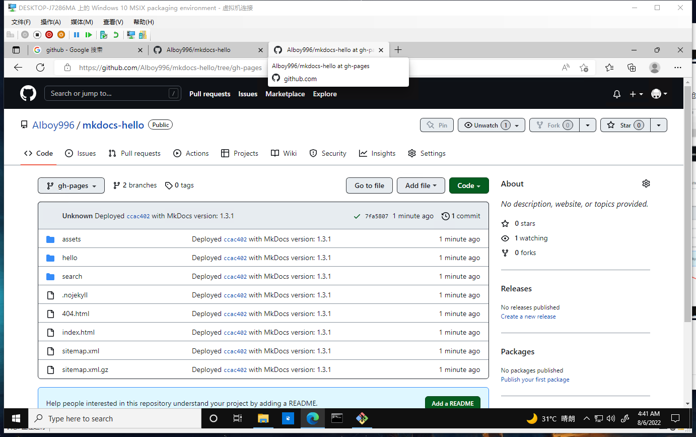 把这里的branch改为刚才生成的gh-pages【这就是前面所说的,指定某个branch发布到gitpages,换言之复制到微软的某个服务器】,即可在上面的网址https://aiboy996.github.io/mkdocs-hello/访问刚才生成的页面了!