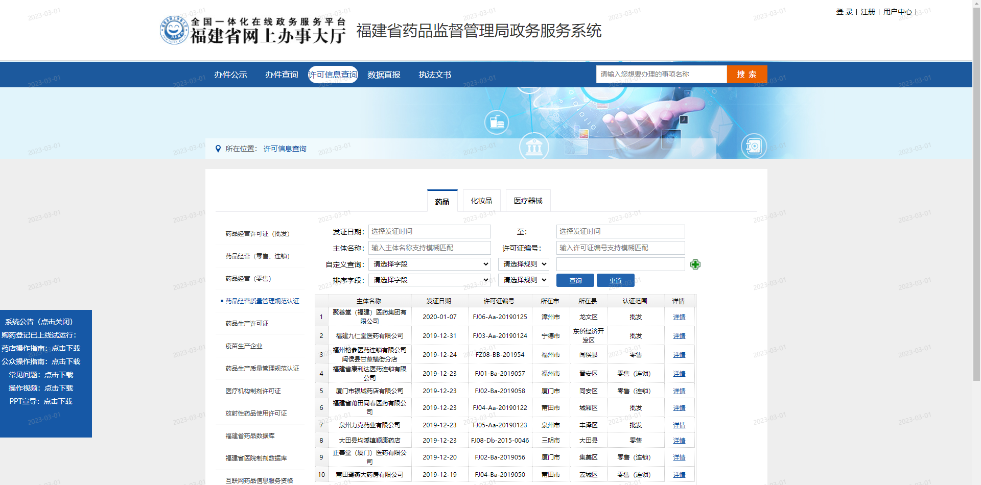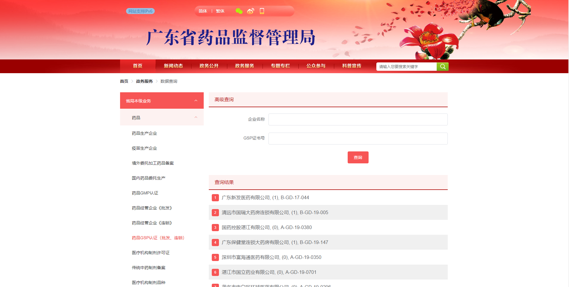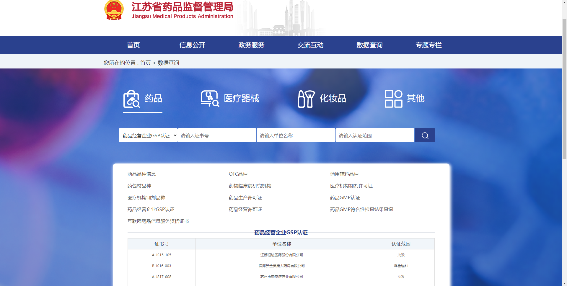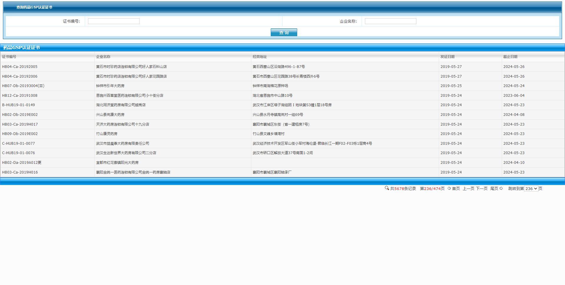 - 有一个药品经营企业查询,结果里面的一部分企业能在国家药监局查到GSP认证信息,一部分查不到