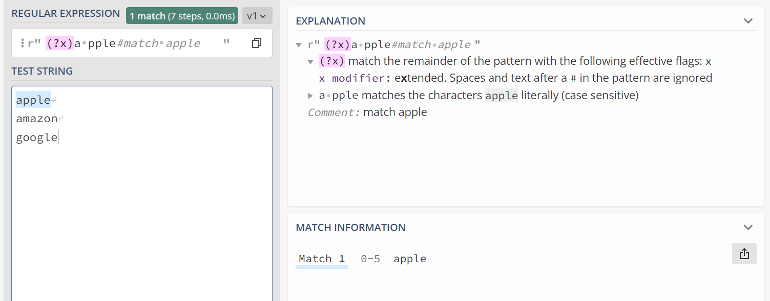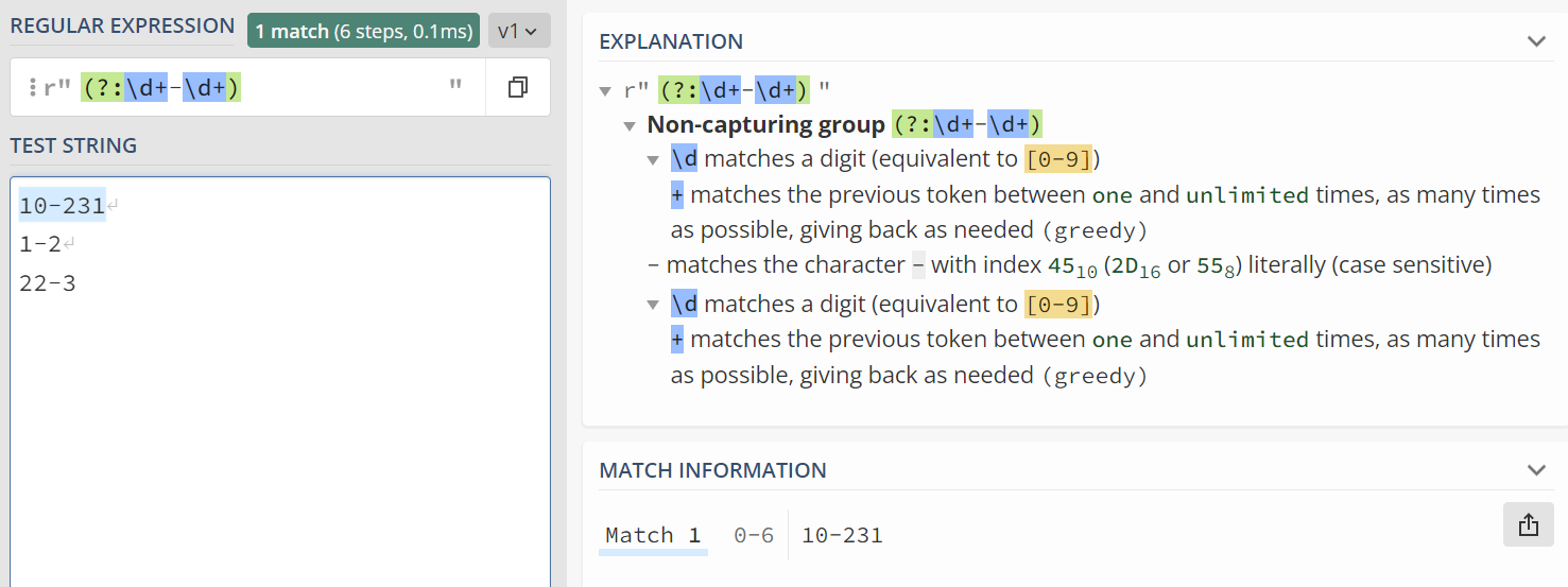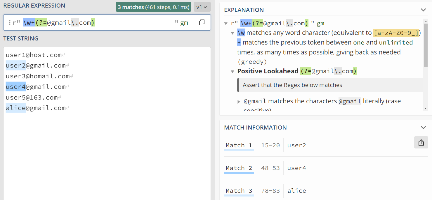 到这里,你大概已经知道正则表达式怎么写了。借助在线调试网站regex101.com我们可以很方便地查看匹配的情况。