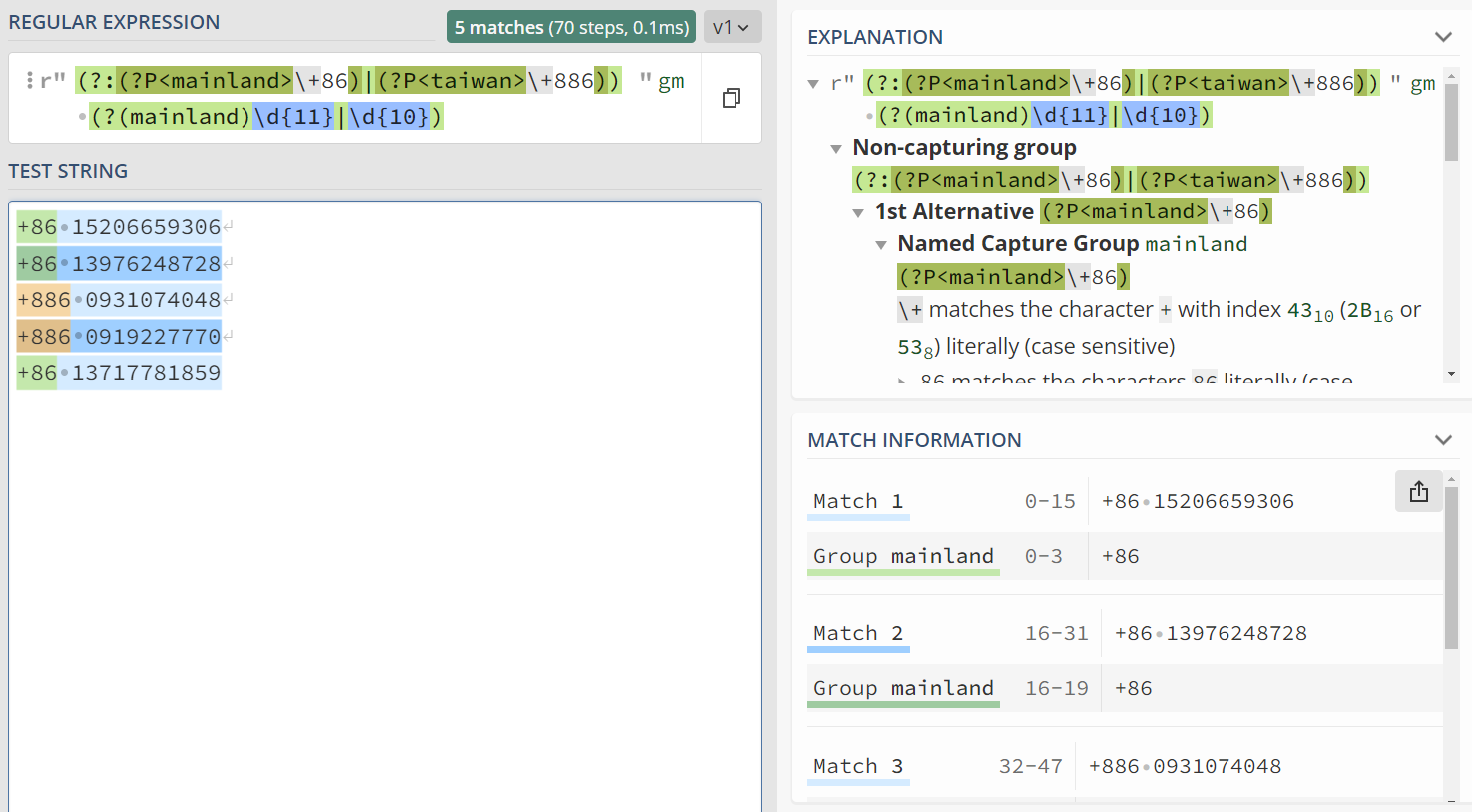 分组命名:(?:(?P<mainland>\+86)|(?P<taiwan>\+886)) (?(mainland)\d{11}|\d{10})¶