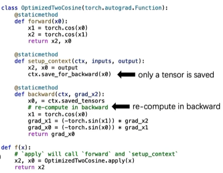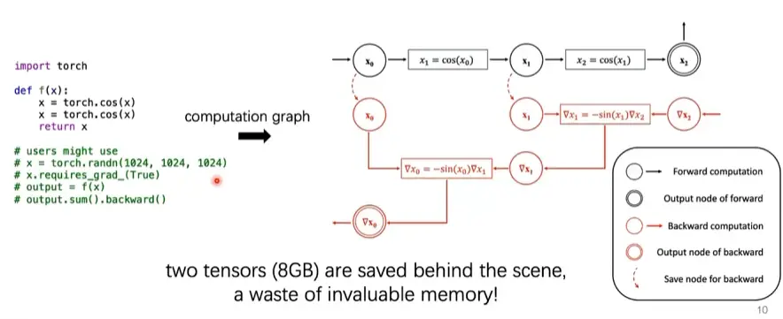 在这个过程中我们会存储两个激活值(x和cos(x))以便计算梯度,这非常占用显存。