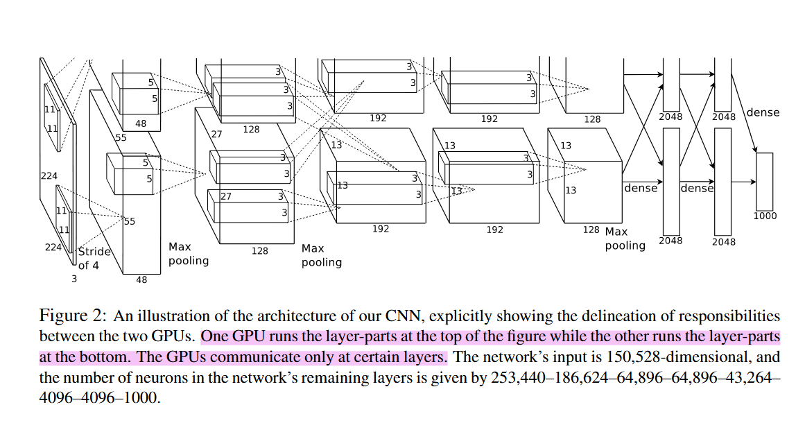 模型并行的一个知名案例是AlexNet(是的,就是2012年那个举世闻名的卷积神经网络),Alex用两张显存3GB的GTX 580完成了62.3M参数规模的训练: