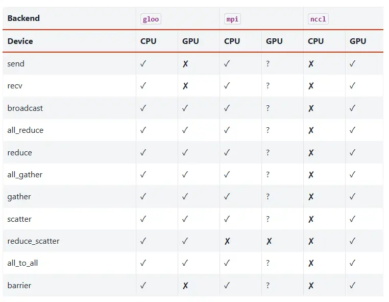 下面这个表展示了torch.distributed支持的不同分布式通信后端以及api: