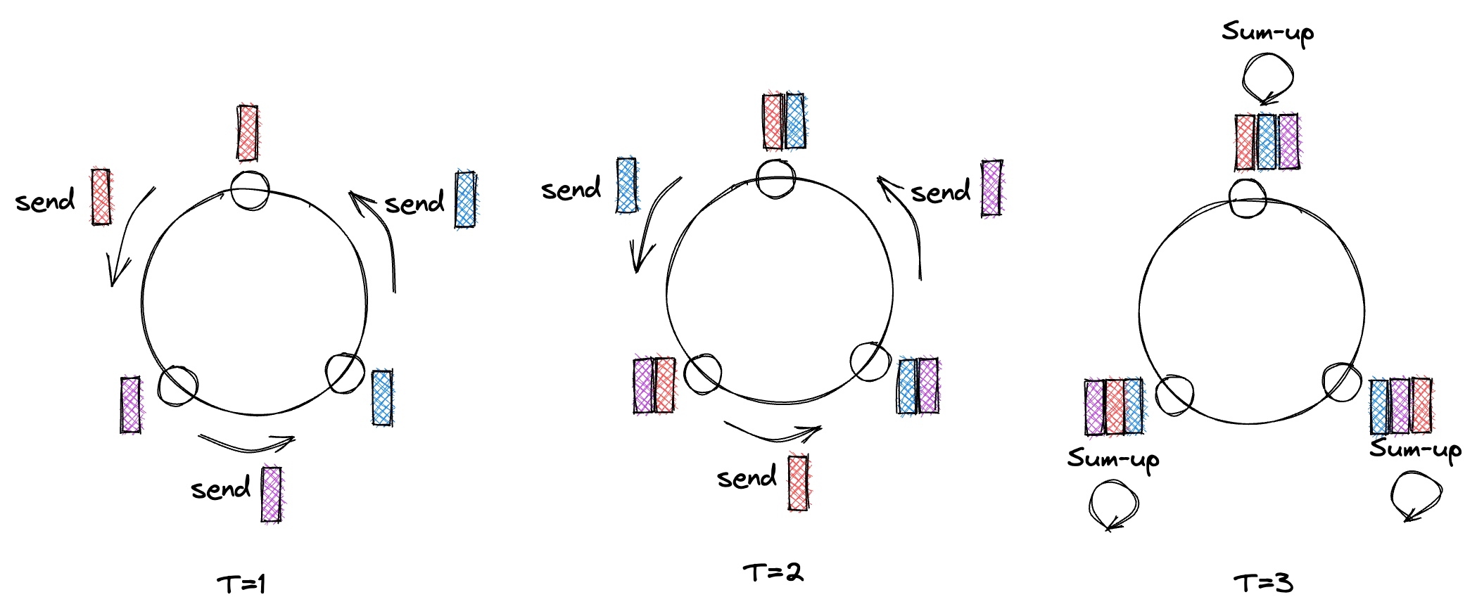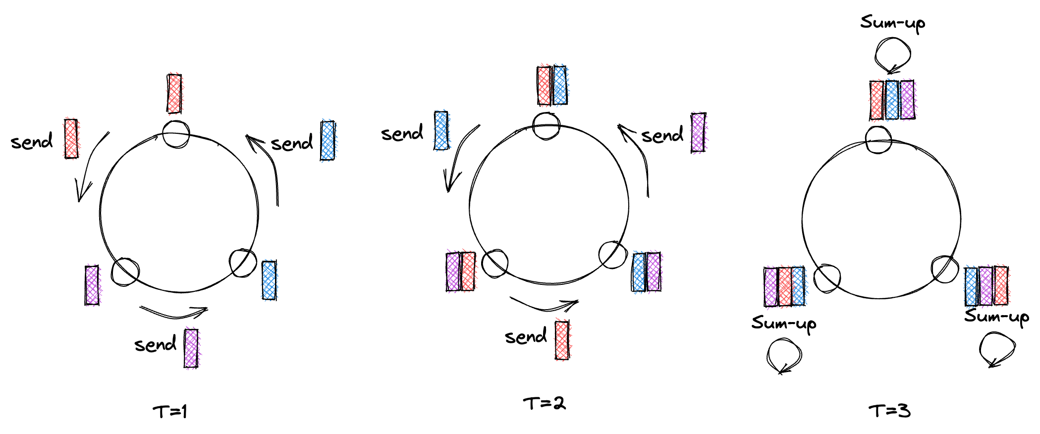 - 节点交换已聚合的分块,经过N-1步后,所有节点获得完整的全局聚合结果。