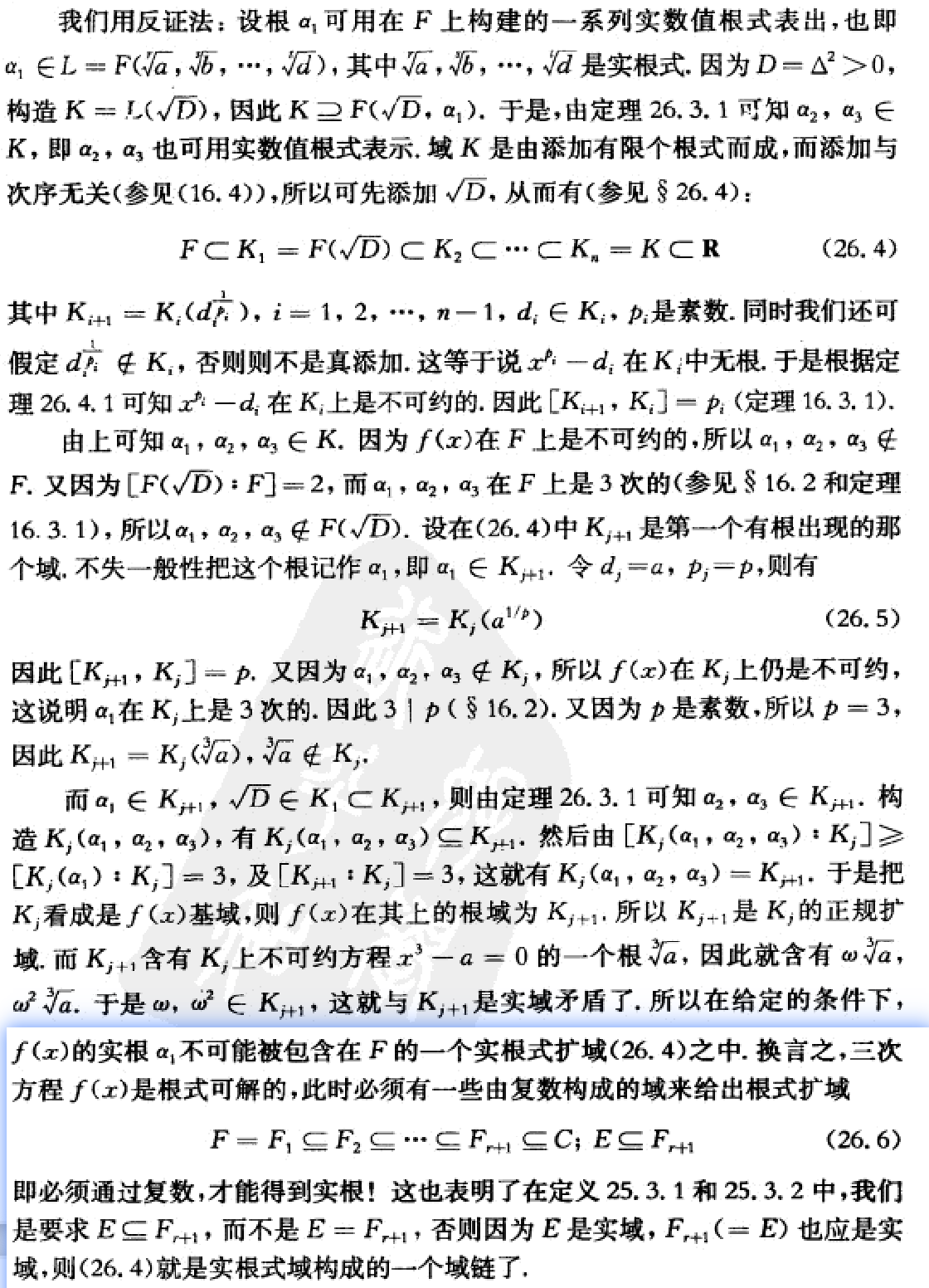 设$f(x) = x^3+px+q \in F(x)$, $F = \mathbb{Q}(p,q) \subseteq \mathbb{R}$,并且$f$在$F$上不可约,并且判别式 $$ D = \left[(x_1-x_2)(x_2-x_3)(x_3-x_1)\right]^2 = -4p^3 - 27q^2 \gt 0 $$ 也就是有三个不等的实根。那么不存在$F$上的一系列实数值根式来得出$f(x)$的求根公式。