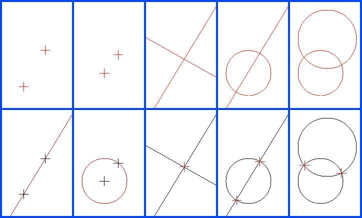 而根据我们前面所说的五条作图公法,尺规作图中产生点有以下几个方法: