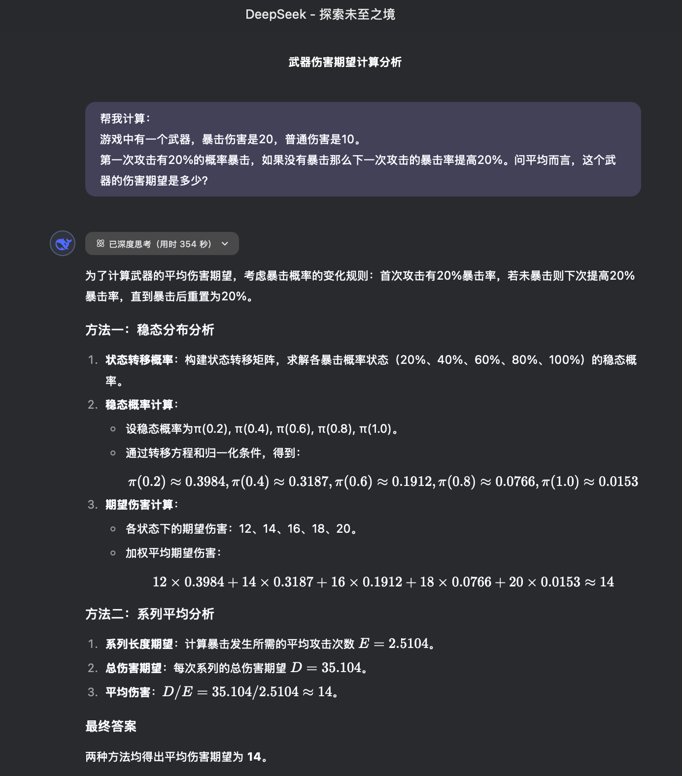 这说明两种不同的方法都得到了同样的结论,即平均期望伤害是14。