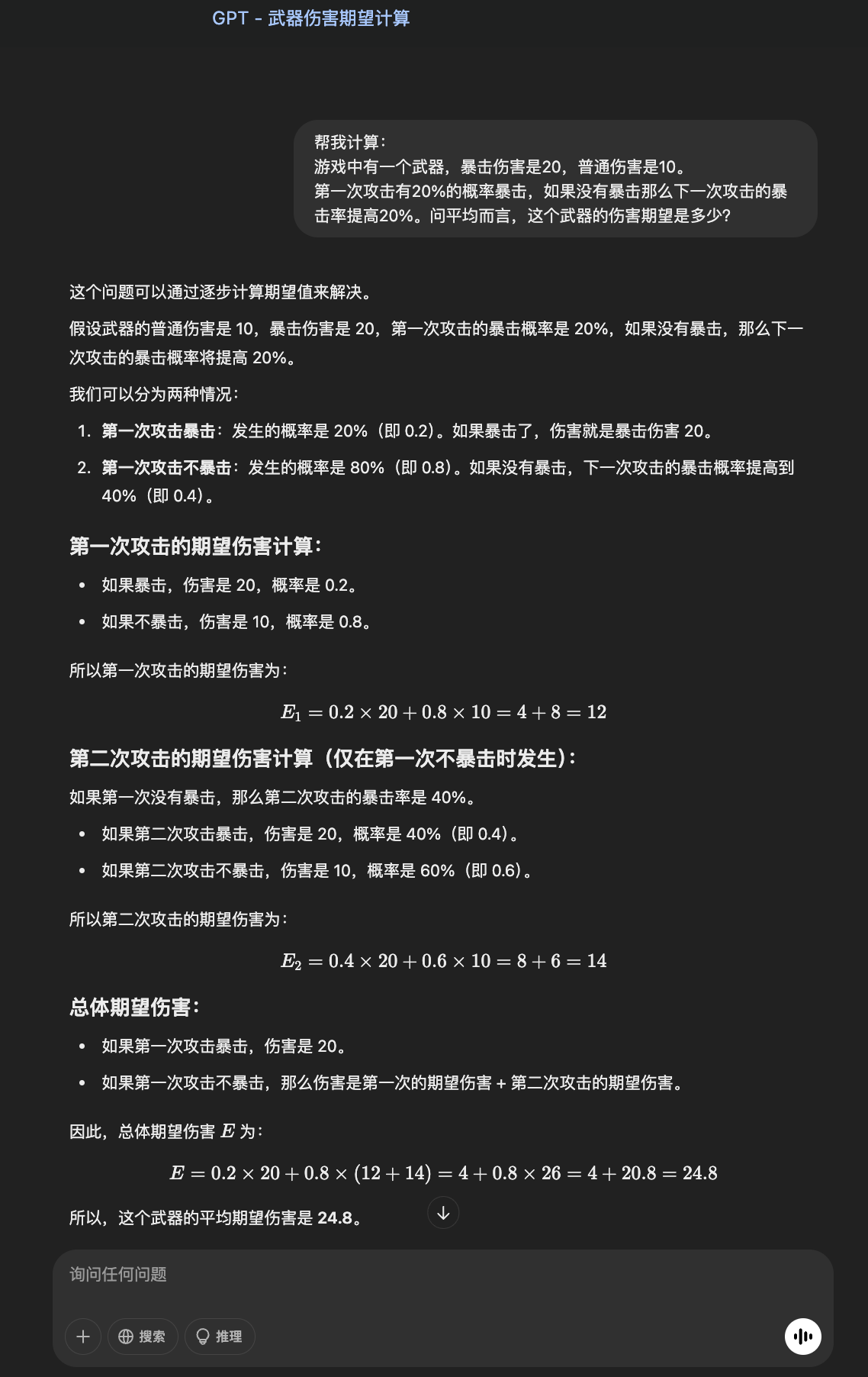 嗯,用户让我计算一个游戏中武器的伤害期望。首先,我需要仔细理解问题。武器的暴击伤害是20,普通伤害是10。第一次攻击有20%的概率暴击,如果没暴击,下一次暴击率提高20%。这个机制看起来像是一个有递增概率的过程,每次未暴击后概率增加,直到暴击触发后重置概率?