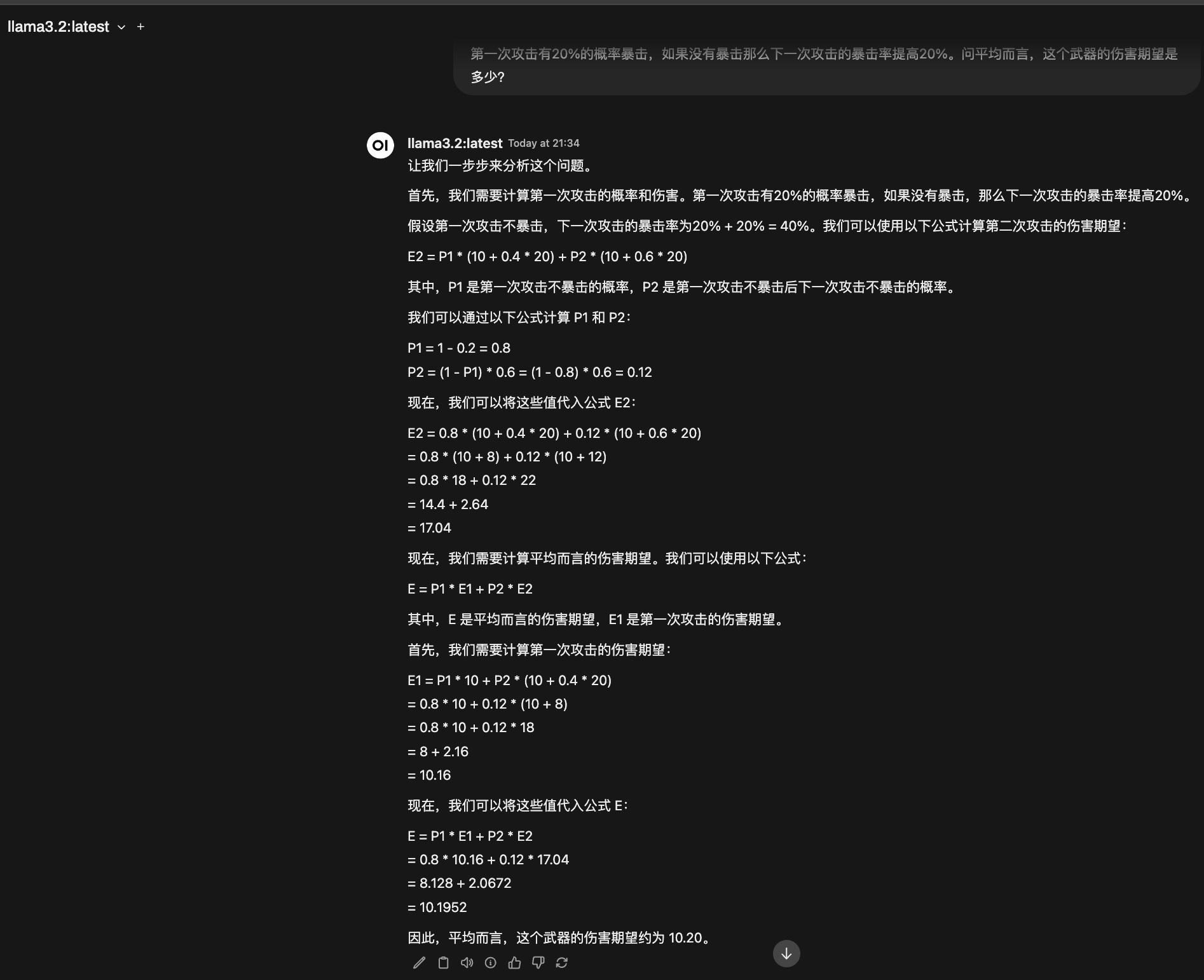 哦,这和我之前的结果一致。所以这个方法是正确的,平均期望伤害是35.104/2.5104≈14。