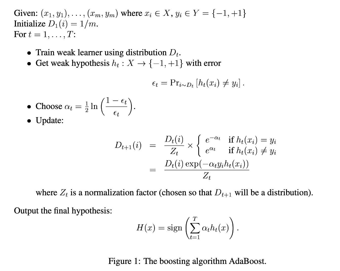 Adaptive Boost是1995年Freund和Schapir提出的算法。下面这张图(来自这里)比较清晰地展示了AdaBoost的算法流程: