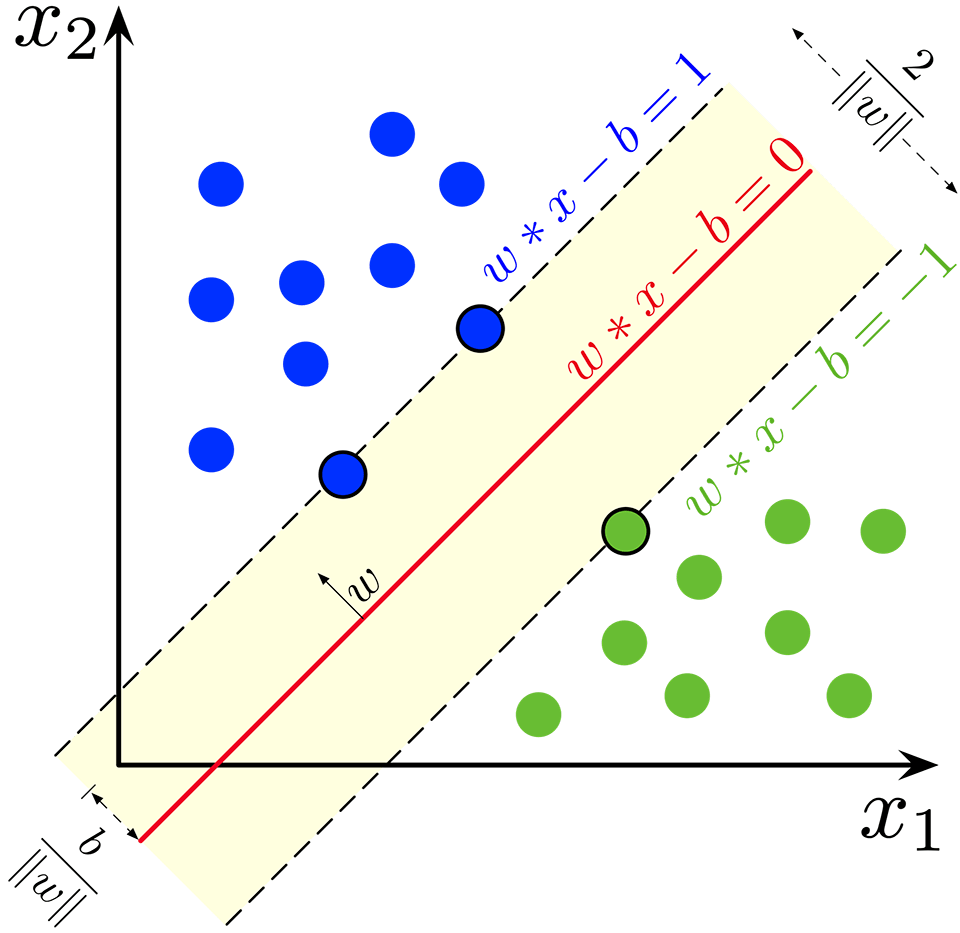 $$ \begin{aligned} &\min_{w,b} \quad \frac{1}{2} w^Tw\\ s.t. &\quad y_i(w^Tx_i-b) \ge 1 \end{aligned} $$